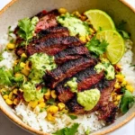 A vibrant and flavorful bowl filled with juicy flank steak, fluffy rice, creamy avocado, and fresh cilantro, perfect for a cozy weeknight dinner.