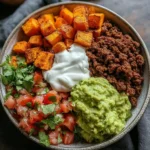 A colorful and comforting taco bowl made with roasted sweet potatoes, ground beef, and fresh toppings, perfect for weeknight dinners.